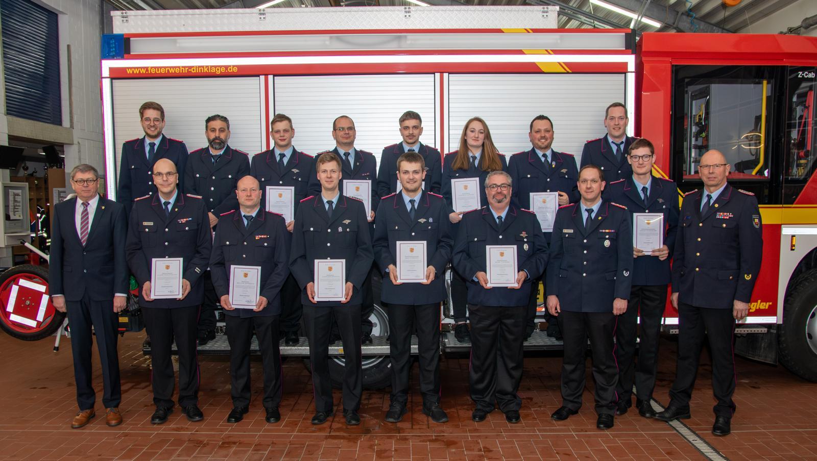 Aus der Jugendfeuerwehr Dinklage können in diesem Jahr drei Mitglieder übernommen werden. Dies waren:  Johannes-Emil Fresenborg, Richard Karsten und Enno Prior. Aufgrund des Erreichens der Altersgrenze oder auf eigenen Wunsch wurden die Kameraden Ludger Albermann, Ludger Baumann und Alfred Dinkelmann offiziell in die Altersabteilung übernommen. Damit verfügt die Feuerwehr Dinklage aktuell über 102 aktive Mitglieder (davon 7 Frauen). Eine weitere Aufnahme in die Altersabteilung gab es für Bürgermeister Putthoff. Er wurde einstimmig als Ehrenmitglied aufgenommen.
