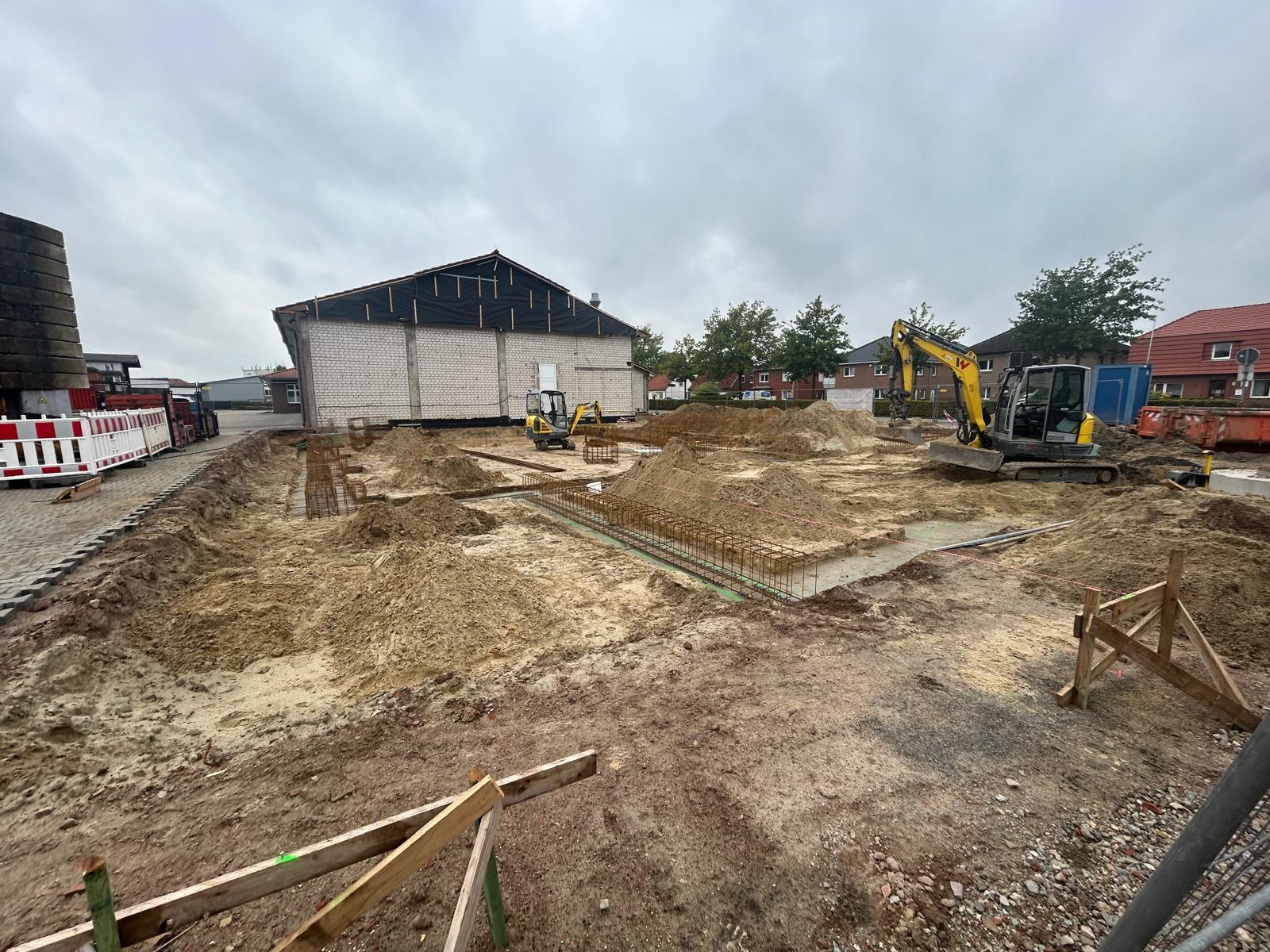 Das ausführende Bauunternehmen Middendorf Bau GmbH aus Dinklage hat in den vergangenen Wochen die vorbereitenden Arbeiten hierfür getroffen. Das betroffene Baufeld wurde geräumt und die Fundamente eingeschalt. Die Grundleitungen und der neue Ölabscheider für die Waschhalle sind auch schon verbaut.