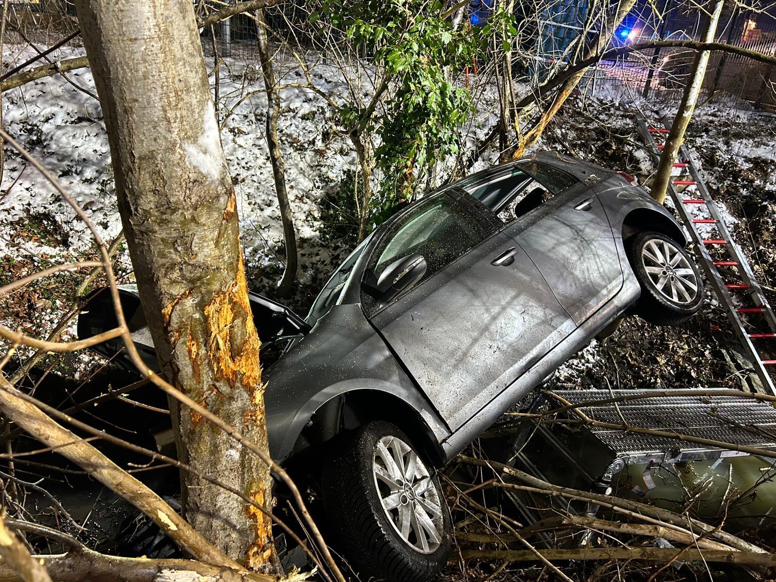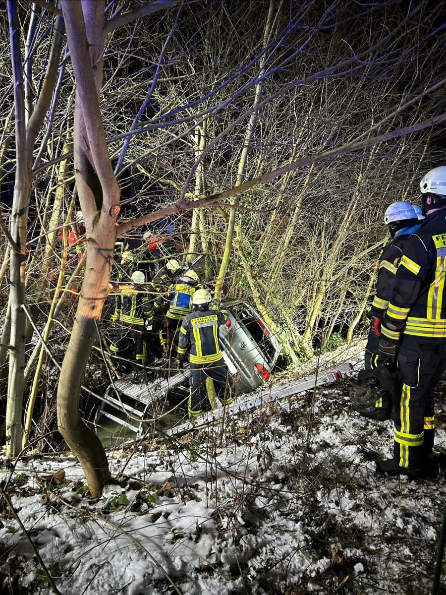 Pkw landet auf winterlicher Straße im Graben – Fahrerin eingeschlossen