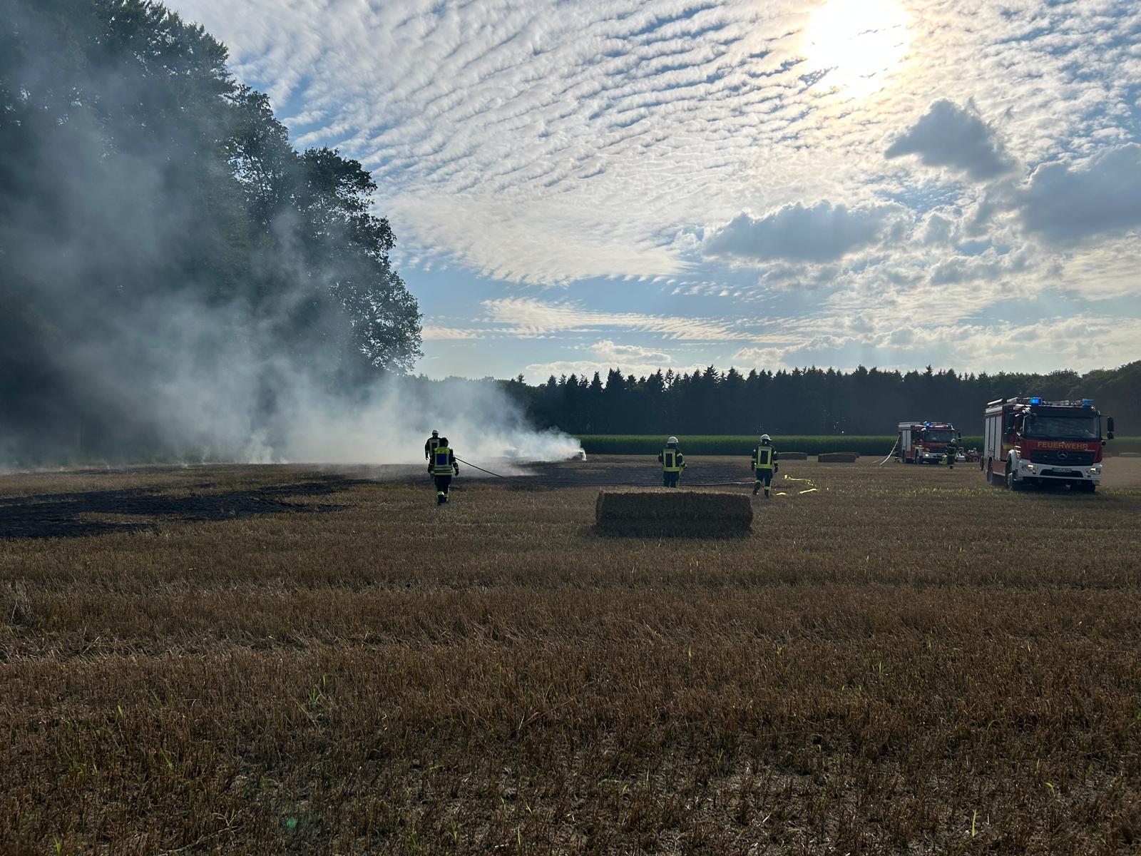 Ein brennender Strohballen hat die Feuerwehr Dinklage am Samstagabend (09.08.2025) auf den Plan gerufen. Der Einsatzleitstelle Vechta wurde gegen 18:00 Uhr ein brennender Strohballen an der Steinfelder Straße gemeldet. Beim Eintreffen der ersten Einsatzkräfte lag die Einsatzstelle nicht direkt an der Steinfelder Straße, sondern auf einem Feld in der Nähe des Burgwaldes.
